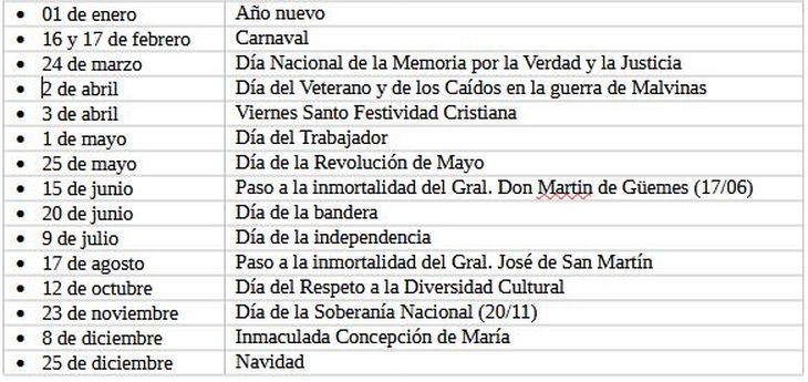 Asimismo, se detallan los feriados nacionales para el año 2026: