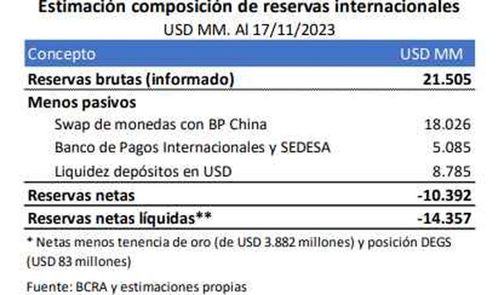 Las reservas internacionales brutas se ubicaban en USD 21.505 millones el 17-nov. Las netas, definidas como las reservas brutas menos los pasivos en moneda extranjera, siguen en terreno negativo, en niveles de -10.392 millones.