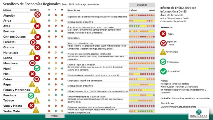 Coninagro publicó el semáforo de economías regionales que releva mensualmente la marcha de las distintas economías y el semáforo del mes de enero muestra: 2 economías verdes, 7 amarillos y 10 rojos, siguiendo la tendencia de los semáforos anteriores.