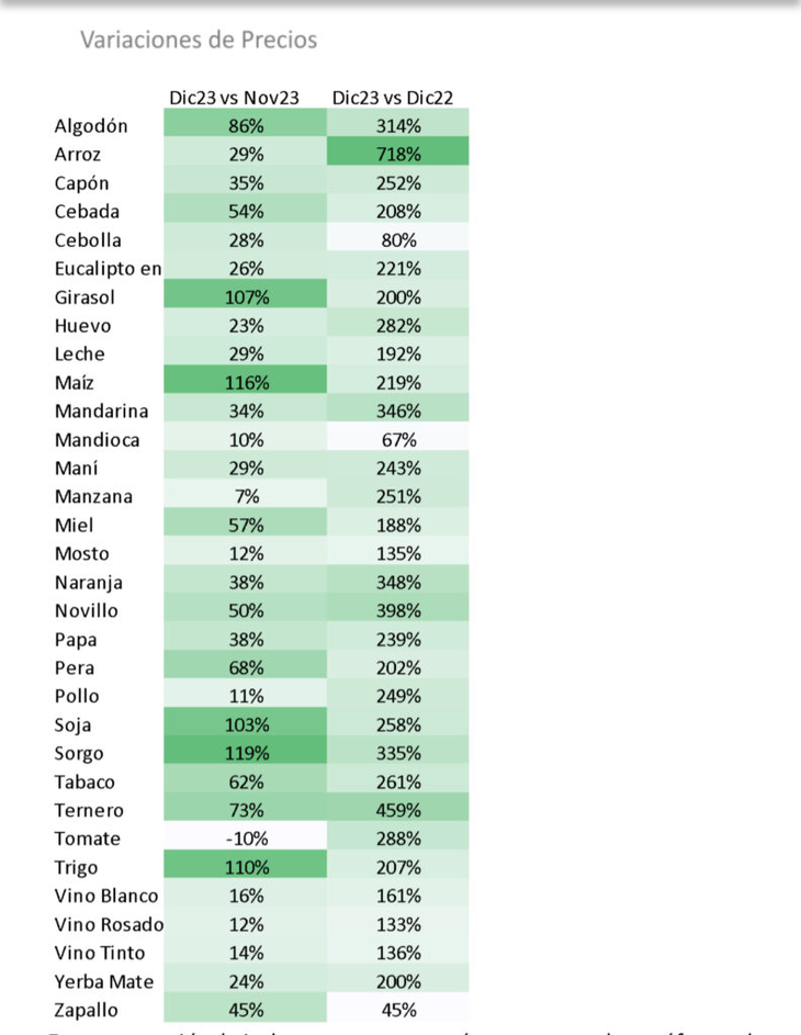 La heterogeneidad es la regla en este comportamiento, con un amplio rango de dispersión, recordando que son precios en pesos corrientes. Si la mirada es entre noviembre y diciembre, los promedios simples de las variaciones mensuales en precios en pesos al productor fueron +38%, siendo el mayor salto en el año 2023.