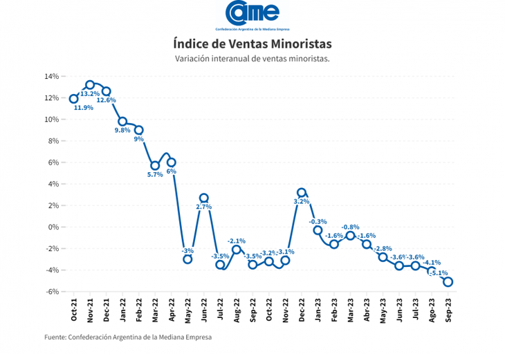Las ventas minoristas de las pymes no se recuperan y volvieron a caer por noveno mes consecutivo en septiembre al retroceder 5,1% anual, por lo que acumulan una baja de 2,6% en los primeros nueve meses del año, frente al mismo periodo de 2022, mientras que, en el contraste intermensual, las ventas descendieron 1,1% con relación a agosto, de acuerdo al relevamiento elaborado por la Confederación Argentina de la Mediana Empresa (CAME).