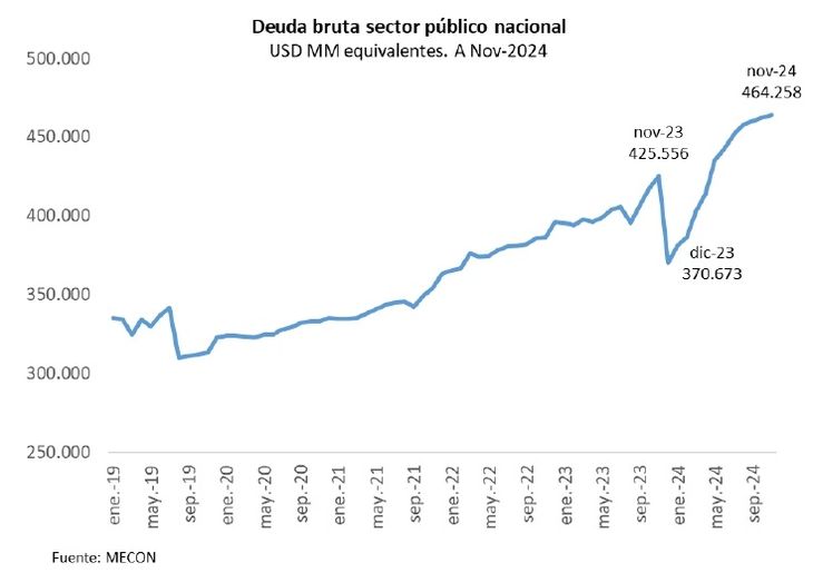 A pesar de que durante 2024 el sector público nacional viene registrando superávit primario de 2,1% del PBI y financiero de 0,6% del PBI (acumulado ene/nov 2024), la tendencia del stock de deuda bruta es creciente a partir de ene-24. En este movimiento confluyen diversos factores, tales como el método de registro -en particular en lo que se refiere a la capitalización de intereses, que equivalen a alrededor de 2% del PBI en el periodo ene/nov24-, la evolución relativa del tipo de cambio, de los precios, tasas de interés, y el traspaso de deuda del Banco Central (BCRA) al Tesoro, a pesar del efecto de licuación de esos pasivos por el período en el que fue negativa la tasa de interés real.