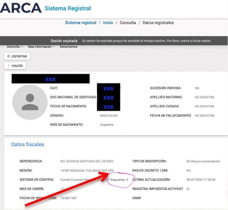 2.- Seleccionar el servicio “Sistema Registral”. Ya dentro del servicio, se deberá ingresar al apartado de “Datos registrales”, donde se podrá ver, en “Datos fiscales”, el segmento asignado por el sistema de control del organismo.