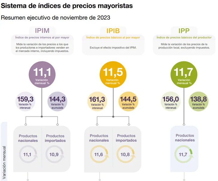 El nivel general del Índice de precios internos al por mayor (IPIM) registró un aumento de 11,1% en noviembre de 2023 respecto del mes anterior. Esta variación es consecuencia de la suba de 11,1% en los “Productos nacionales” y de 10,9% en los “Productos importados”. De esta forma, en el último año los precios mayoristas subieron 159,3%, apenas por debajo del índice general de precios.