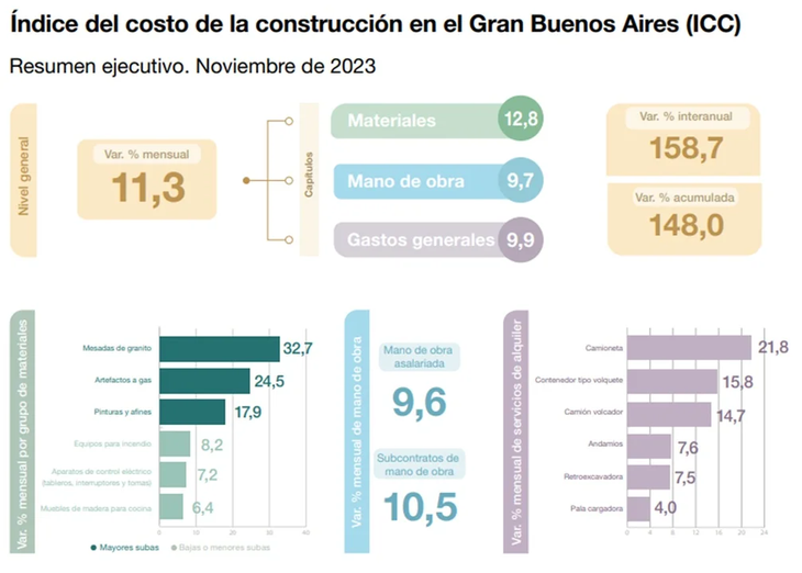 El nivel general del Índice del costo de la construcción (ICC) en el Gran Buenos Aires correspondiente a noviembre de 2023 registró una suba de 11,3% respecto al mes anterior. Este resultado surge como consecuencia de un alza de 12,8% en el capítulo “Materiales”, de 9,7% en el capítulo “Mano de obra” y de 9,9% en el capítulo “Gastos generales”.