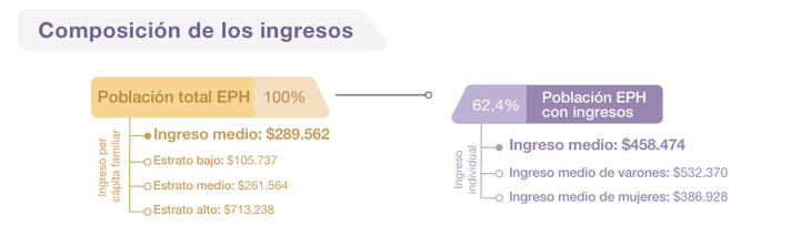 El ingreso promedio per cápita del total de la población, que corresponde a 29.656.209 personas, alcanzó los $289.562, mientras que la mediana del ingreso per cápita fue de $205.000. Los perceptores varones tuvieron un ingreso promedio de $532.370, mientras que el de las mujeres fue de $386.928.
