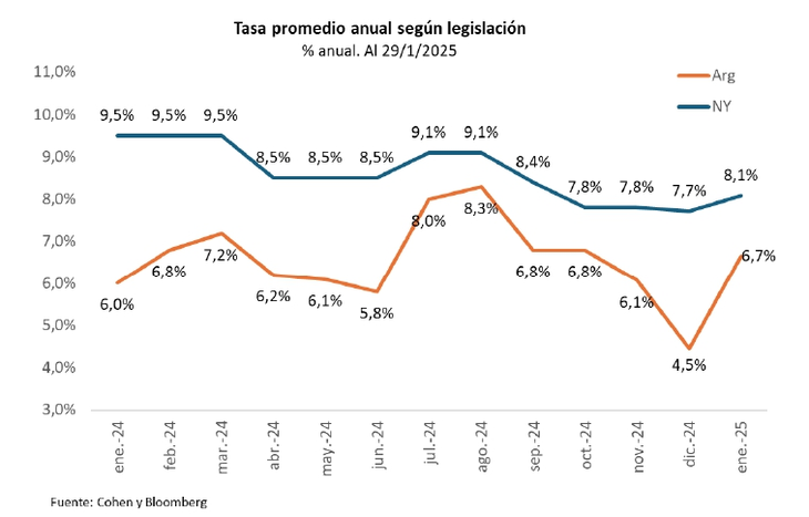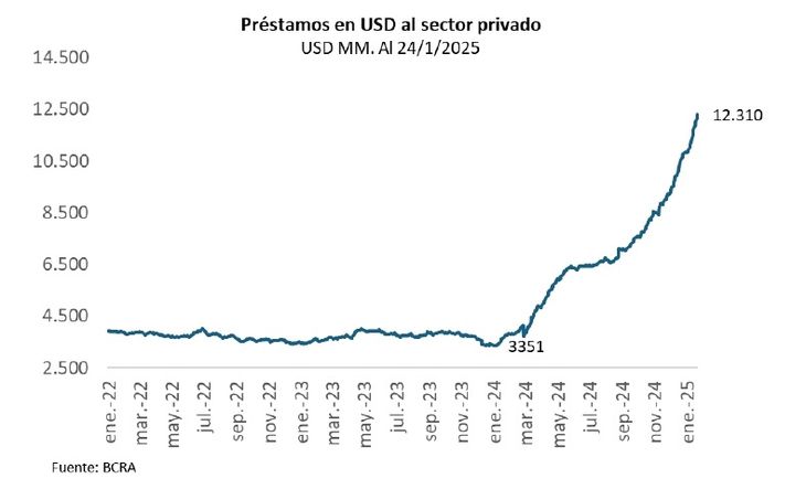 Los préstamos bancarios en dólares al sector privado superan los 12.300 millones en esa misma moneda (datos al 23-ene-25), un aumento de casi 9.000 millones de dólares respecto de fines de 2023.