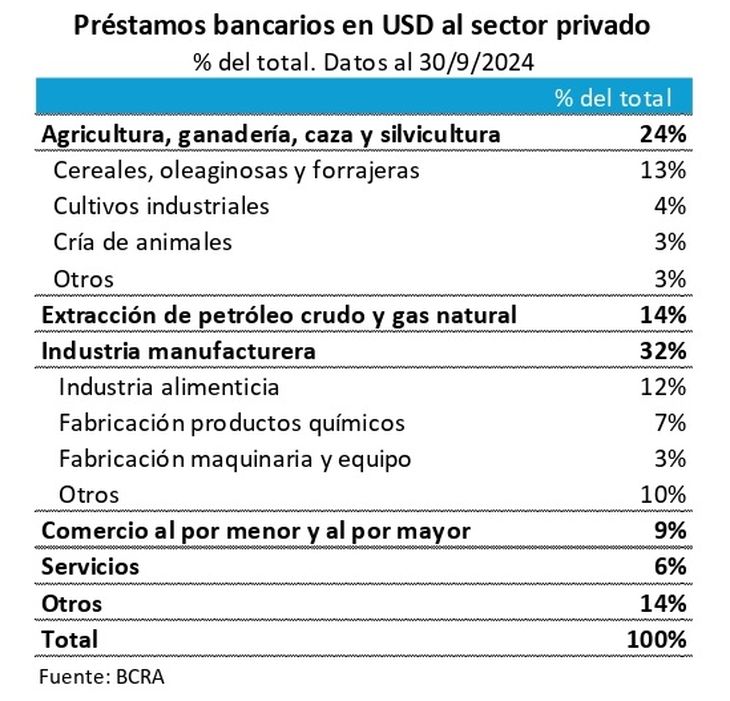 El incremento, que se aceleró desde sept-24 en el marco del blanqueo de efectivo. Implicó que los depósitos en dólares del sector privado más que se duplicaran, hoy en niveles de 32.000 millones de dólares. Los sectores a los que se dirigió la mayor parte de los préstamos bancarios en dólares fueron: la industria 32%, -de los cuales el sector alimenticio y químico representan el 12% y 7%, respectivamente- el sector agropecuario el 24% del total, de los cuales el sector de cereales y oleaginosas son los de mayor incidencia (13%) -principalmente como prefinanciación de exportaciones-, y extracción de petróleo crudo y gas natural (14%).