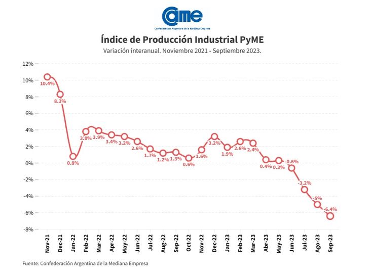 La producción de la industria manufacturera pyme bajó 6,4% en septiembre frente al mismo período del año pasado, de acuerdo a un informe de la Confederación Argentina de la Mediana Empresa (CAME).