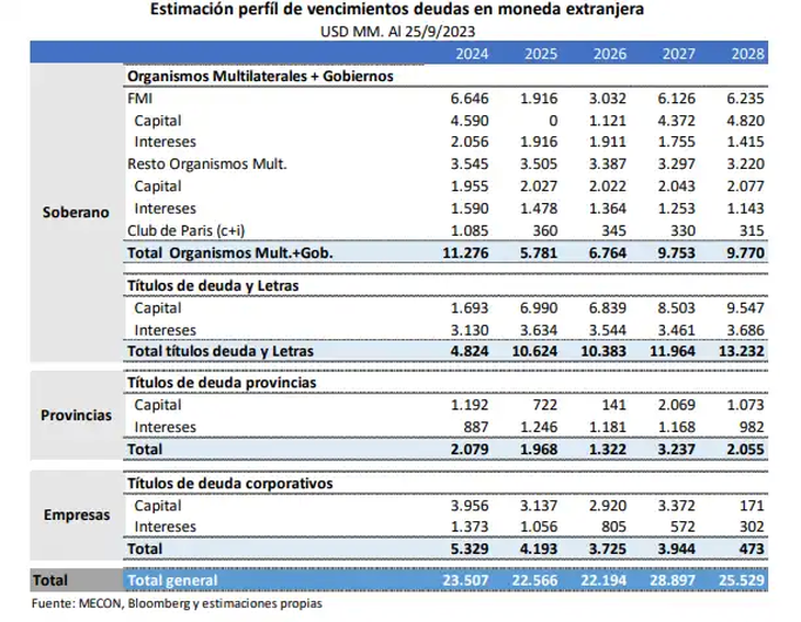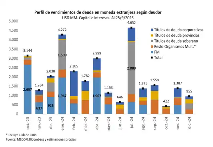 Si bien hay programado un desembolso del FMI en noviembre 2023 de 3.300 millones de dólares, es difícil pensar que se materialice antes de la renegociación que efectúen las autoridades nacionales que asuman el 10 de diciembre. Además, en enero de 2024 hay un nuevo vencimiento de capital con el organismo por 1.967 millones de dólares y alrededor de 1.600 millones de vencimientos de intereses de la deuda reestructurada en 2020. Los desembolsos previstos en todo 2024 en el actual acuerdo con el FMI son sólo de 3.200 millones de dólares (DEG 2.400 millones). Obtener nuevo financiamiento de ese organismo será uno de los temas que deberá afrontar inmediatamente el nuevo gobierno.