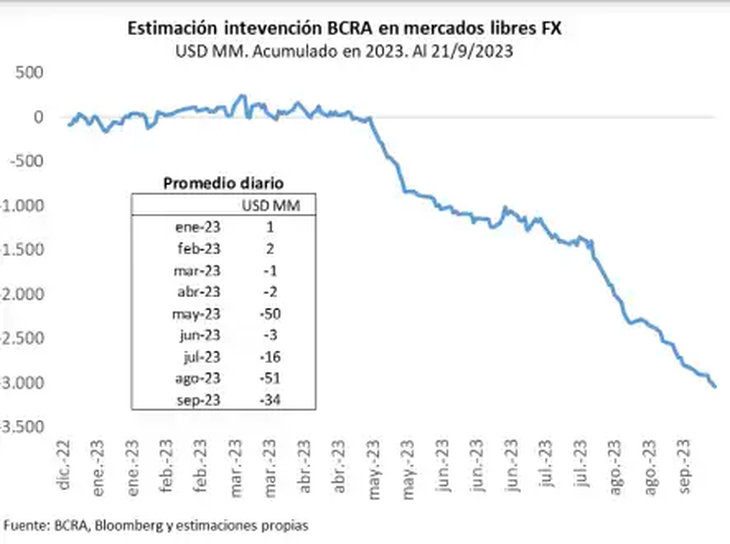 En mayo 2023 comenzó el proceso de dolarización que en oportunidades antecede a los procesos electorales, -es mayor cuanto mayor es la incertidumbre sobre los distintos programas económicos que podrían implementarse-. En el actual la incertidumbre es alta. En agosto 2023 se aceleró la dolarización de portafolios. Para enfrentarlo, el BCRA intervino vendiendo divisas en los mercados libres, con un promedio diario de intervención de 51 millones de dólares, tendencia que continúa en lo que va de septiembre, aunque con una intervención algo menor, 34 millones diarios.