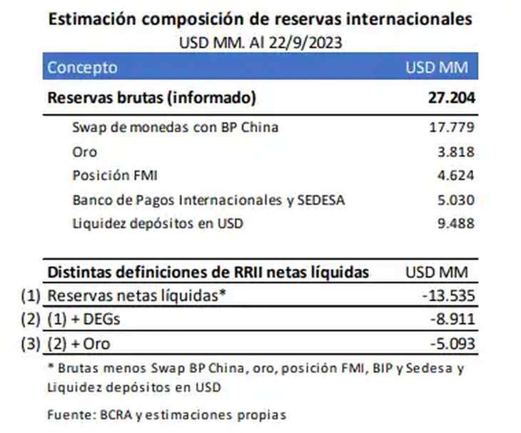 En estas circunstancias los stocks de reservas brutas y netas están en niveles bajos. En una definición parcialmente restrictiva de las reservas netas -incluyendo oro y posición de reservas del FMI- desde fines de abril 2023 son negativas, una tendencia que se profundiza a pesar del desembolso que hizo el FMI a fines de agosto 2023.