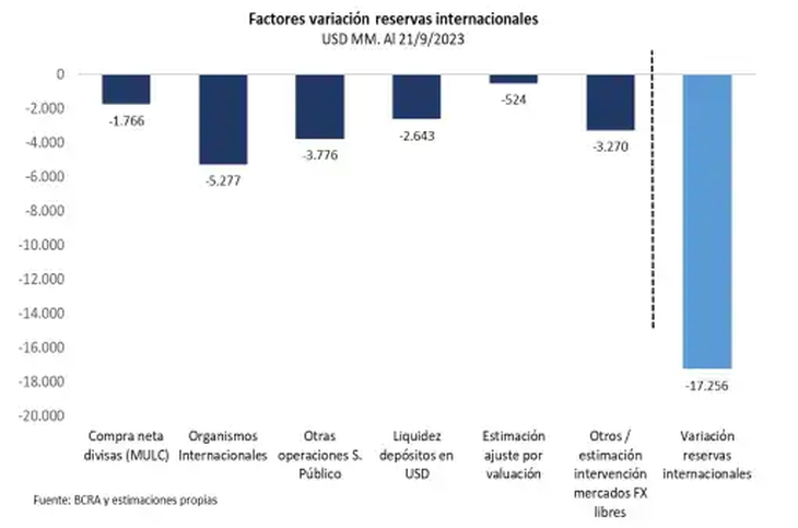 En el transcurso del año -datos al 21 de septiembre- el Banco Central de la República Argentina (BCRA) perdió 17.256 millones de dólares de reservas, principalmente por: pagos netos a Organismos Internacionales por 5.277 millones, 3.776 millones de otros pagos netos del Gobierno -en gran medida servicios de deuda- y disminución de la liquidez que los bancos tienen en el BCRA como contrapartida de los depósitos en dólares (1) (caída de 2.643 millones de dólares).