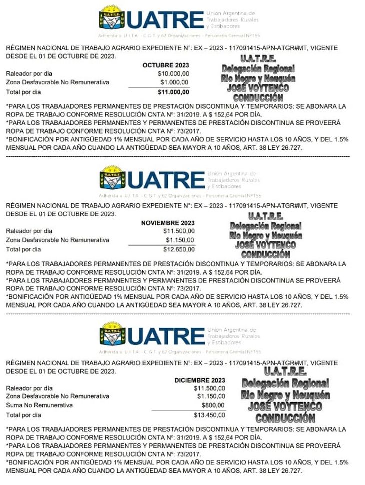 Será del 55% para el personal permanente de prestación continua (Peón General) comprendido en el Régimen Nacional de Trabajo Agrario, en el ámbito de todo el país. También hubo aumento para los raleadores de fruta.