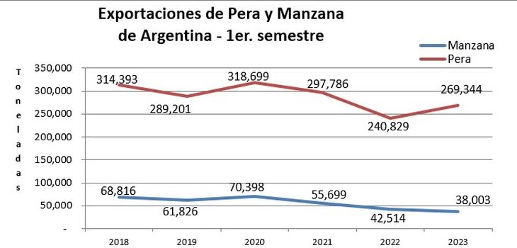 La temporada de exportaciones del primer semestre de 2023, evidencia la continuidad de las tendencias que han experimentado en los últimos años. Las estadísticas muestran una recuperación de los volúmenes exportados de pera con respecto a 2022, y la persistente tendencia declinante de los envíos de manzana. En términos de toneladas exportadas, resalta la acentuada reducción que vienen experimentando las ventas externas de manzana, habiéndose reducido prácticamente a la mitad de los volúmenes máximos de años anteriores.