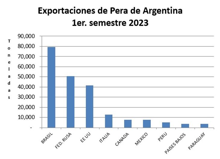 Las peras argentinas arribaron a 46 destinos, con una proporción significativa de envíos a mercados de Europa, América del Norte y Brasil. Esto posibilita acceder a un mayor número de países, con diferentes variedades y calidades. Las exportaciones de esta especie, a pesar del retraso en el tipo de cambio, no pueden ser desviadas hacia el mercado interno, que muestra reducidos índices de consumo, y por lo tanto deben continuar siendo comercializadas en mercados de exportación. La presencia de la región patagónica en los mercados de los países desarrollados es de larga data, y aún se mantiene la vigencia de su tradicional calidad.
