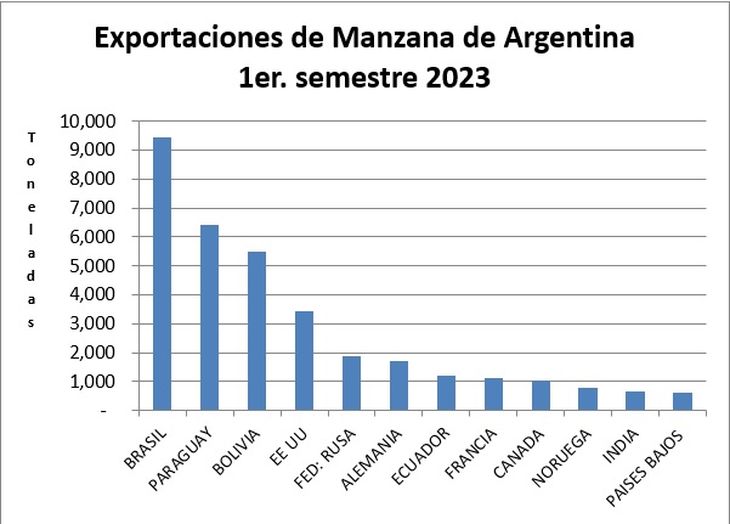 Las exportaciones de manzana se dirigieron a 26 países, con una proporción significativa de envíos al Mercosur y otros países de Sudamérica. Básicamente, las exportaciones de esta especie han quedado limitadas a los países vecinos, que reciben el 60% de las cantidades exportadas. Algunas variedades que se implantaron con perspectivas de exportar a países de Europa y América del Norte son enviadas hacia esos destinos, lo que evidencia que la renovación de variedades es la vía para posibilitar un aumento de exportaciones, pero las condiciones macroeconómicas del país atentan contra proyectos de inversión cuyo retorno es de largo plazo.