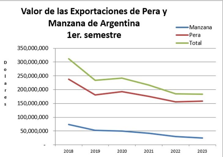 Las estadísticas de exportaciones de pera y manzana de Argentina son un reflejo de la comercialización externa regional, y posibilitan trazar un panorama de la evolución de las exportaciones en el primer semestre de cada año, cuando finalizan las ventas a la mayor parte de los mercados del hemisferio norte. Las provincias de Rio Negro y Neuquén participan con el 90% del volumen total de exportaciones del país de estas dos frutas.