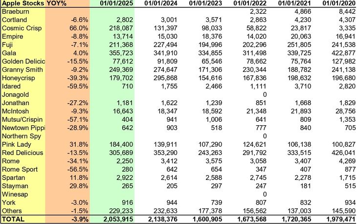 El movimiento de existencias de manzanas disminuyó en 2025 en comparación con 2024, siguiendo una tendencia más amplia de reducción de la oferta. El movimiento total disminuyó por un margen mayor que el año anterior, marcando un descenso interanual del 3,9%. Mientras que las manzanas Cosmic Crisp y Pink Lady registraron un mayor movimiento, Red Delicious y Fuji experimentaron reducciones significativas. A continuación el gráfico resumiendo la evolución de los stocks en Estados Unidos, en toneladas.