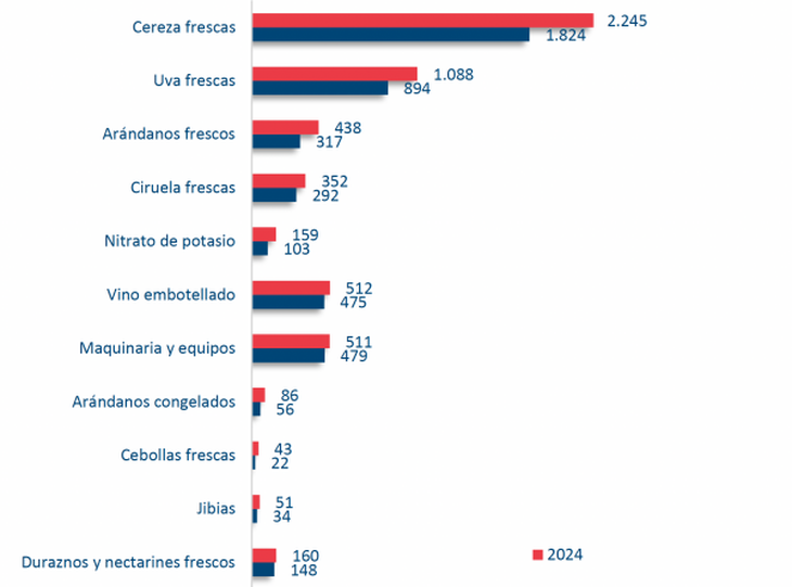 Respecto a los envíos de bienes, en el período totalizaron US$ 41.784 millones (+US$ 784 millones), dinamismo explicado por el alza registrada por los concentrados de cobre, cerezas frescas, uva fresca, celulosa, oro, arándanos frescos, hierro, ciruelas frescas, nitrato de potasio y fruta congelada, entre otros. Estos incrementos compensaron los descensos registrados en los envíos de litio y molibdeno.