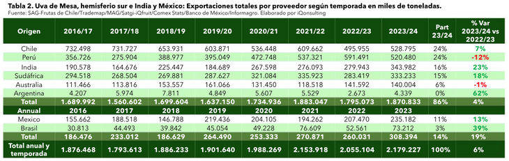 Según el anuario de uva de mesa de iQonsulting, los envíos de uva de mesa desde el hemisferio sur más México e India aumentaron un 6% durante esta temporada 2023-2024, alcanzando 2,2 millones de toneladas (266 millones de cajas de 8,2 kg), principalmente impulsadas por el incremento de la oferta de Chile (+7%), India (+23%) y Sudáfrica (+18%).