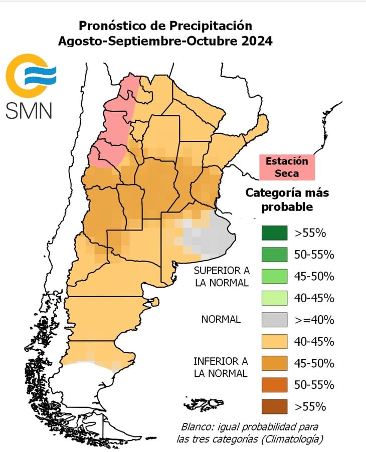 A continuación, el pronóstico completo del período agosto-octubre 2024 elaborado por el SMN.