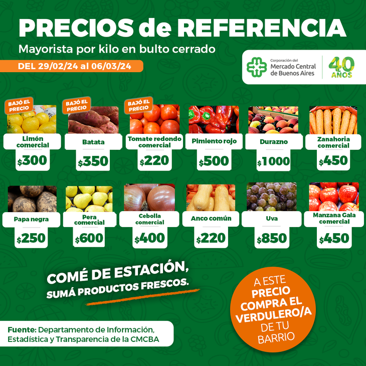 Los valores promedio de venta en el segmento mayorista del Mercado Central de Buenos Aires (MCBA), referente de la venta de productos frutihortícolas del área comercial de CABA y GBA, muestran en la semana 10 una significativa caída respecto del mismo período del año anterior.