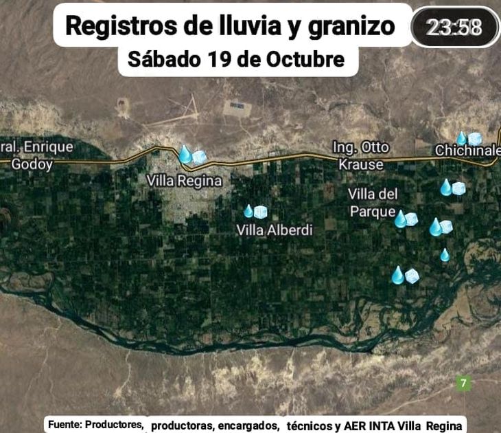 Los productores frutícolas y aquellos dedicados a la horticultura estuvieron atentos este fin de semana por estas formaciones de tormenta con presencia ocasional de granizo para toda la región del Alto valle de Río Negro y Neuquén. Ayer a las 19.30 los sistemas de tormentas con chaparrones y posible granizo avanzaban hacia el sudeste de la Provincia tal se refleja en la imagen a continuación.