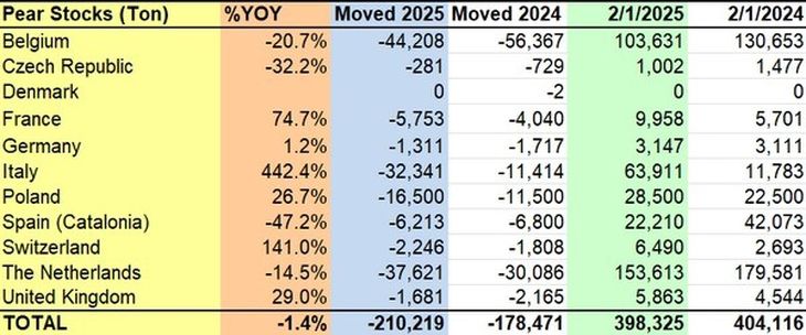 Las existencias de peras en Europa al 1 de febrero de 2025 fueron de 398.325 toneladas, mostrando una disminución del 1,4% respecto al mismo período del año anterior. Sin embargo, las variaciones entre países fueron marcadas. Mientras que Bélgica (-20,7%), la República Checa (-32,2%), España (-47,2%) y los Países Bajos (-14,5%) registraron caídas significativas, otros países experimentaron un notable aumento en sus existencias. Entre estos últimos se destacan Italia (+442,4%), Suiza (+141,0%), Francia (+74,7%) y el Reino Unido (+29,0%).