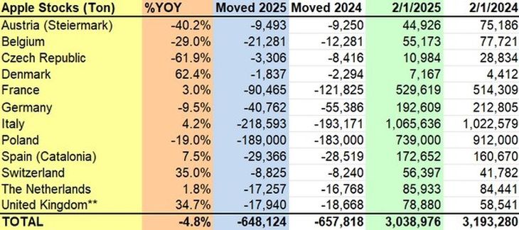 Las existencias de manzanas en Europa alcanzaron las 3.038.976 toneladas, reduciéndose en más de 154.000 toneladas en comparación con el año anterior. Entre los países con mayores caídas en sus stocks se encuentran Austria (-40,2%), Bélgica (-29,0%), República Checa (-61,9%) y Polonia (-19,0%). Alemania e Italia también registraron descensos, del 9,5% y el 4,2%, respectivamente.