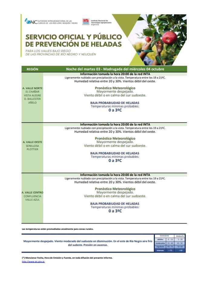 El pronóstico de heladas elaborado por la AIC y el INTA para la noche del martes 3 y la madrugada del miércoles 4 de octubre fue: Mayormente despejado. Viento moderado del sudoeste en disminución. En el este de Río Negro aire frío del sudeste. Presión en ascenso.