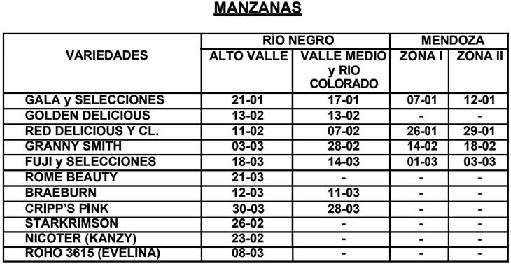 Las autorizaciones de cosecha de las variedades no especificadas en el cuadro serán solicitadas a las Comisiones Regionales Patagonia y Cuyo. Por otro lado, los adelantos de cosecha para las variedades con fecha establecida de las zonas de Alto Valle, Valle Medio y Mendoza serán analizados por las comisiones mencionadas, quienes elevarán al SENASA la evaluación, a fin de que éste autorice la fecha de adelanto del calendario.