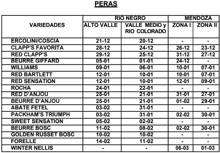 Desde el INTA Alto Valle se difundió el calendario tentativo de cosecha (sujeto a correcciones por cuestiones climáticas), y se estableció que para la pera William's el día de inicio de cosecha será el 9 de enero en el Alto Valle y el 6 de enero en Valle Medio. Para manzanas, entre las variedades más difundidas, se determinó que se habilita la cosecha para la variedad Gala y sus clones a parir del día 21 de enero en Alto Valle y para el 17 de enero en Valle Medio.