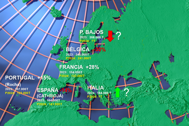 Bélgica ha sufrido daños ocasionados por heladas, granizadas y lluvias persistentes y abundantes, y calcula una producción de 241.000 toneladas, un 30% por debajo de la pasada campaña, que fue de 345.000 toneladas. En cuanto a Países Bajos, los daños han sido causados por un invierno relativamente caluroso que ha provocado una floración muy precoz, y por la incidencia de las granizadas, y aunque no avanzan datos de previsión, valoran que no podrá ser un año de cosecha completa. En 2023 recolectaron 358.000 toneladas de pera. Ambos países han experimentado una abundante caída de la floración en su variedad estrella, que es la pera Conference.