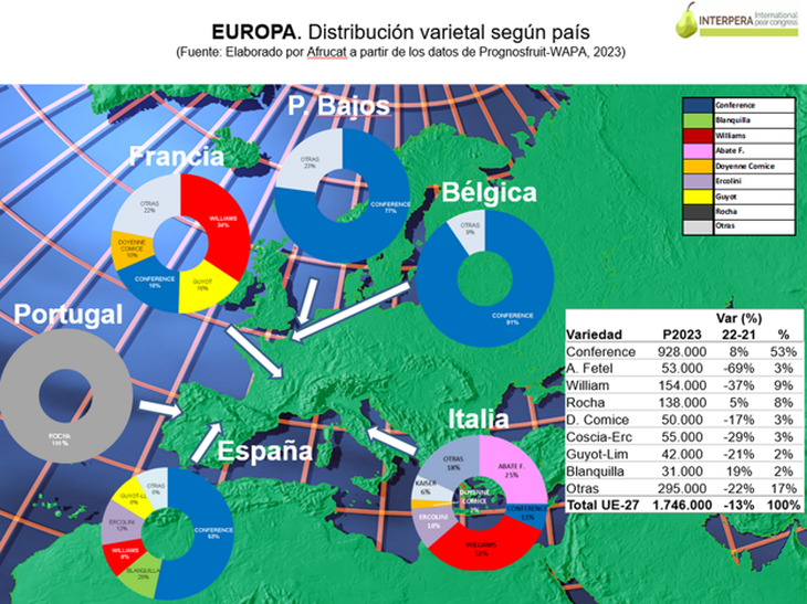 Con una cosecha en 2023 de cerca del millón de toneladas, la Conference es la principal pera que se produce en Europa, básicamente en Bélgica, Países Bajos y España. El segundo lugar lo ocupa la pera Williams, producida principalmente en Italia, Francia y España y, en el tercer lugar, se sitúa la pera Rocha, que está producida al 100% en Portugal siendo la pera hegemónica en ese país.