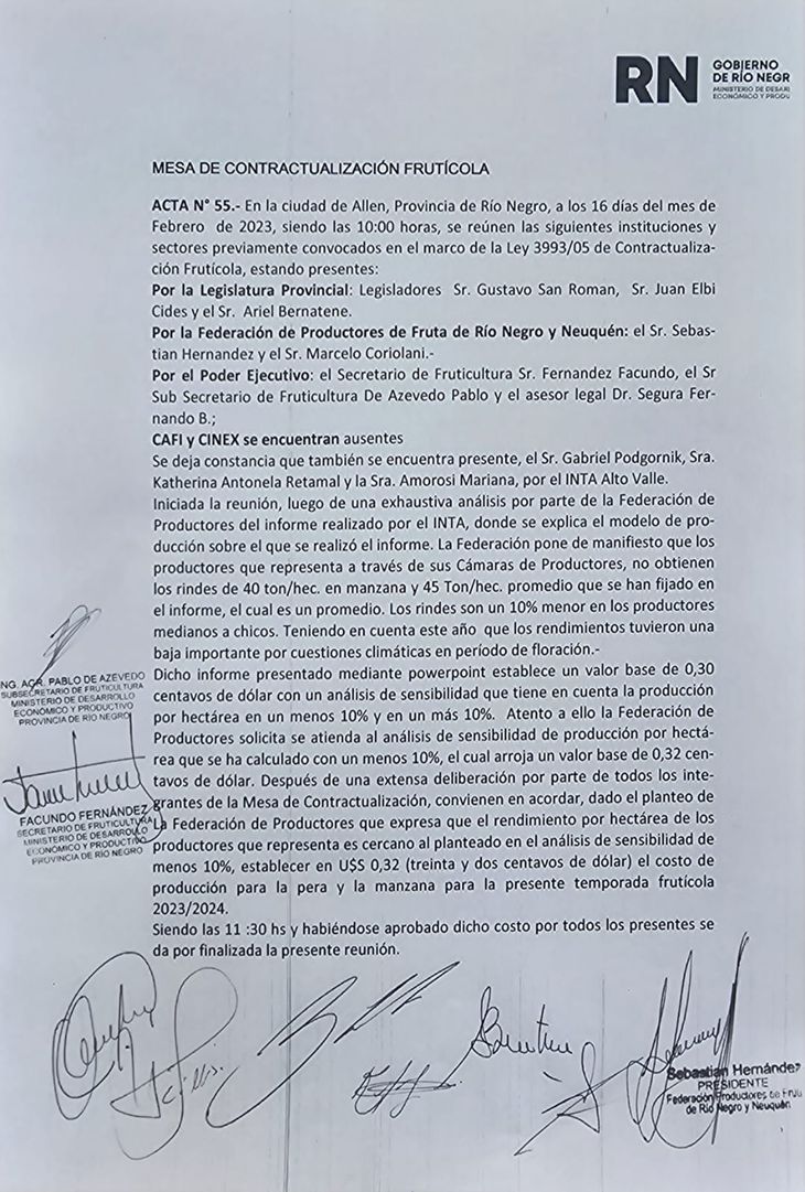 En palabras de Sebastián Hernández, presidente de la Federación de Productores de Fruta de Río Negro y Neuquén, los productores no obtienen los rindes de 40.000 kg/ha de manzanas y 45.000 kg/ha de peras, como lo indica el resultado promedio presentado en el informe técnico del INTA, siendo los rindes un 10 % menor en productores medianos a pequeños. Atento a ello, y luego de una deliberación entre las partes convocadas, la mesa acordó fijar un valor de 0,32 dólar por kilogramo para peras y manzanas como costo de producción durante la presente temporada, sugiriendo el propio Facundo Fernández "volver a analizarlo al menos dos veces más durante este año y agregar variables que hoy inciden notablemente, como el costo de almacenamiento en frío y los fletes”.