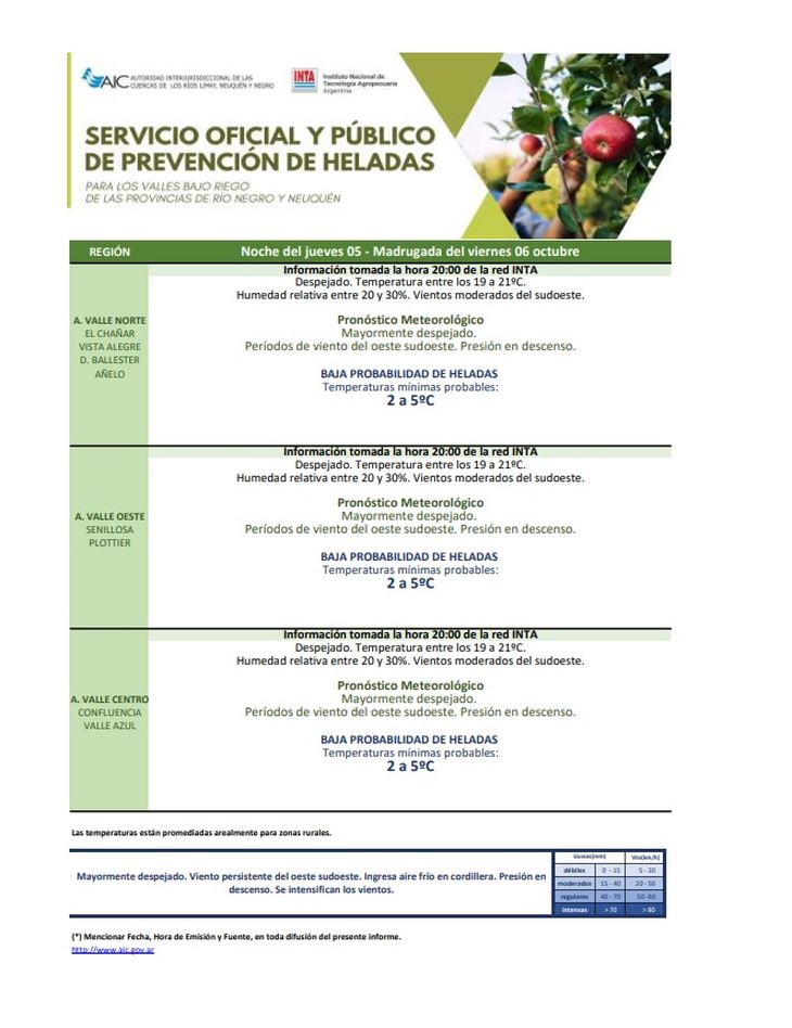 El pronóstico de heladas elaborado por la AIC y el INTA para la noche del jueves 5 y la madrugada del viernes 6 de octubre fue: Mayormente despejado. Viento persistente del oeste sudoeste. Ingresa aire frío en cordillera. Presión en descenso. Se intensifican los vientos.