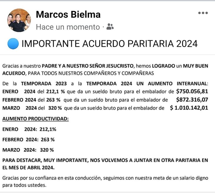 Según comunicaron desde SOEFRNYN, el sueldo bruto del embalador quedará entonces en poco más de 750.000 pesos para el mes en curso. El secretario general del sindicato de la fruta dio a conocer, a través de las redes sociales, los nuevos haberes que se detallan a continuación.