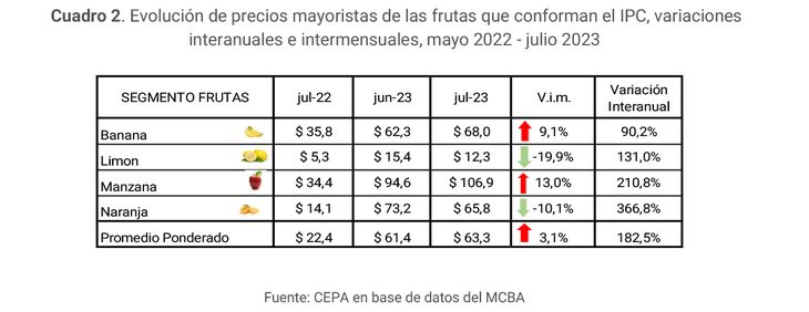 Entre las frutas, la naranja, a pesar de haber disminuido su precio 10,1% en julio, muestra la mayor variación interanual, del orden de 366,8% (217,3% más que la Inflación interanual del mes de junio); mientras que el limón fue el que más disminuyó su precio (19,9%).