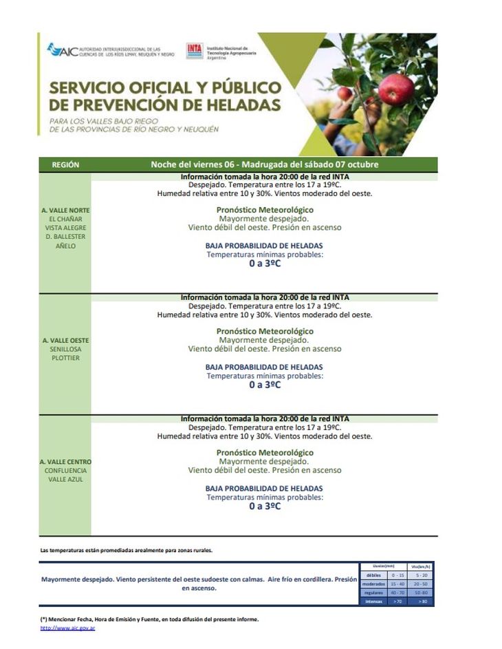 El pronóstico de heladas elaborado por la AIC y el INTA para la noche del viernes 6 y madrugada del sábado 7: Mayormente despejado. Viento persistente del oeste sudoeste con calmas. Aire frío en cordillera. Presión en ascenso.