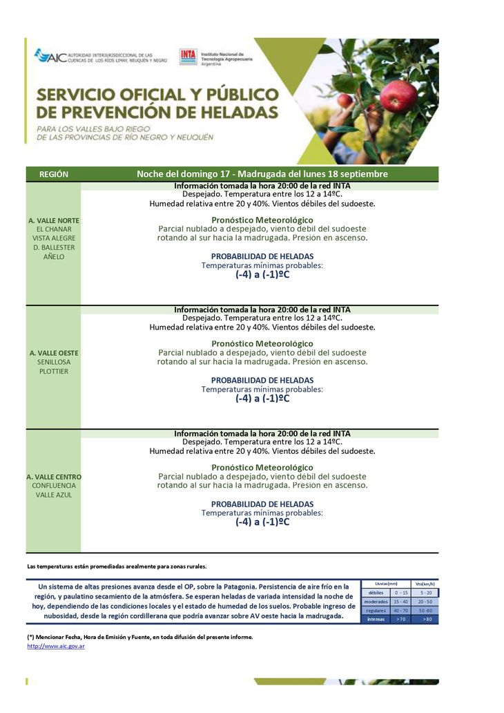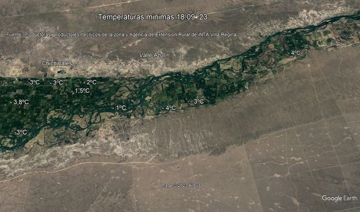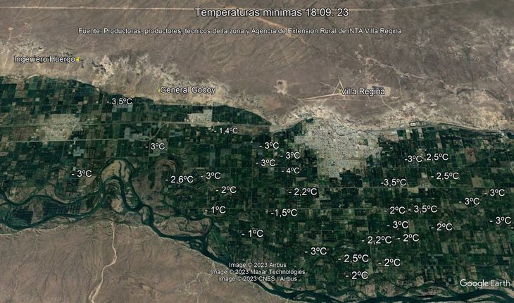 Las bajas temperaturas se manifestaron en toda la región. Dependiendo de la duración, se pueden esperar daños en carozos y variedades de peras Early William's, Forelle y D'Anjou. Mapas con los detalles de temperaturas, trabajo realizado por el Ing. Sergio Ziaurriz, de la AER Villa Regina, INTA con la colaboración de los productores, encargados y técnicos.