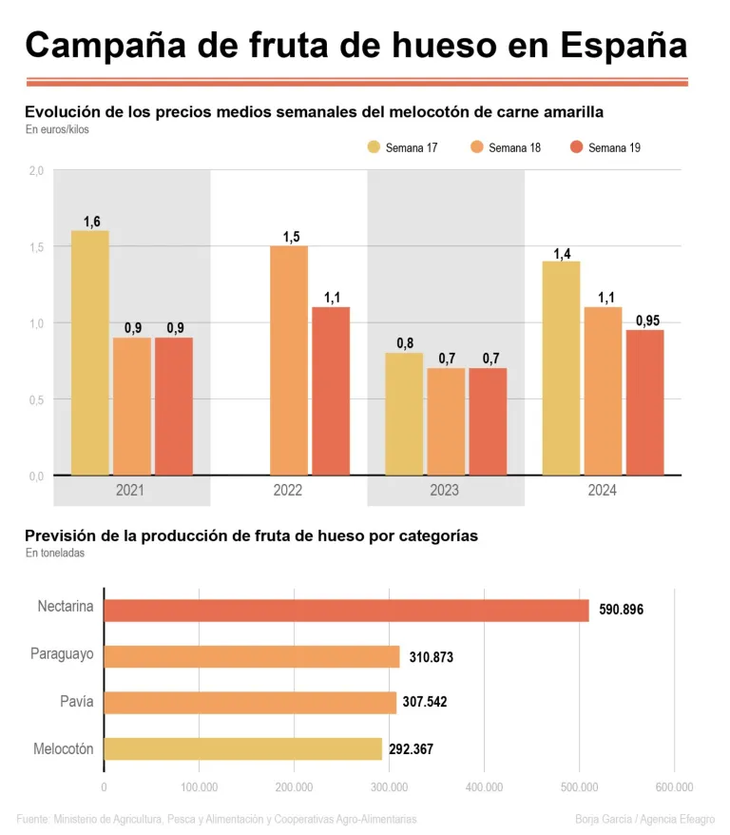 Por producciones, la nectarina es la fruta con mayor volumen, con 590.896 toneladas, un 1 % más que la campaña anterior, seguida del paraguayo, del que se estima que baje un 4 % su producción, con un total de 310.873 toneladas.