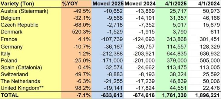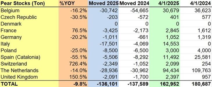 Por su parte, el mercado de la pera también refleja un escenario similar, aunque con una caída aún más pronunciada. Las existencias de pera en Europa, al 1 de abril de 2025, se ubicaron en 162.952 toneladas, un 9,8% menos que las 180.687 toneladas del mismo mes del año anterior. Las bajas más significativas se observaron en España (Cataluña), que redujo su volumen en un 55,1%, pasando de 25.581 toneladas a apenas 11.492. También Polonia, Alemania e Italia registraron disminuciones de 25%, 20,2% y 10.484 toneladas, respectivamente.