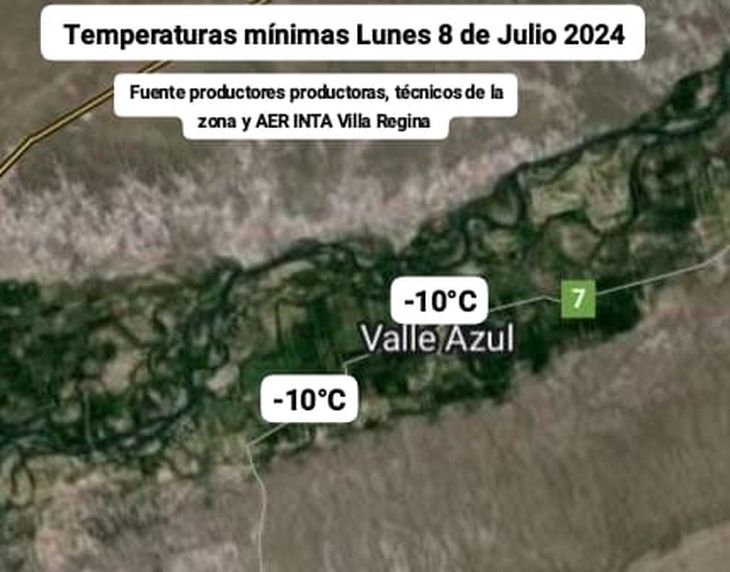 Las temperaturas mínimas más bajas se observaron en Ingeniero Huergo y la zona de Chichinales. Los valores que mas frecuencia registraron fue en torno a los -10°C. La información fue elaborada por el INTA Villa Regina, con el aporte de productores y técnicos de la zona.