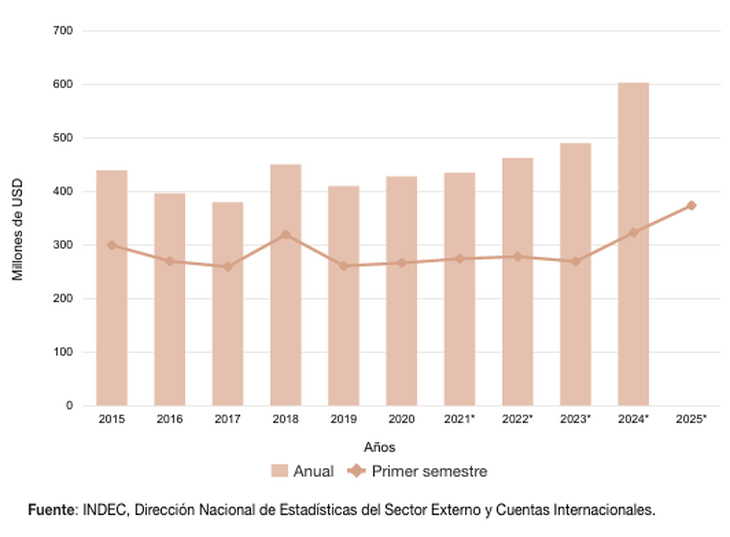 La evolución de las exportaciones de Río Negro en los últimos años también revela una tendencia positiva. Desde 2022, la provincia incremento consistentemente sus ventas al exterior. De hecho, pasó de USD 278 millones (primer semestre de 2022) a USD 373 millones (primer semestre de 2025).