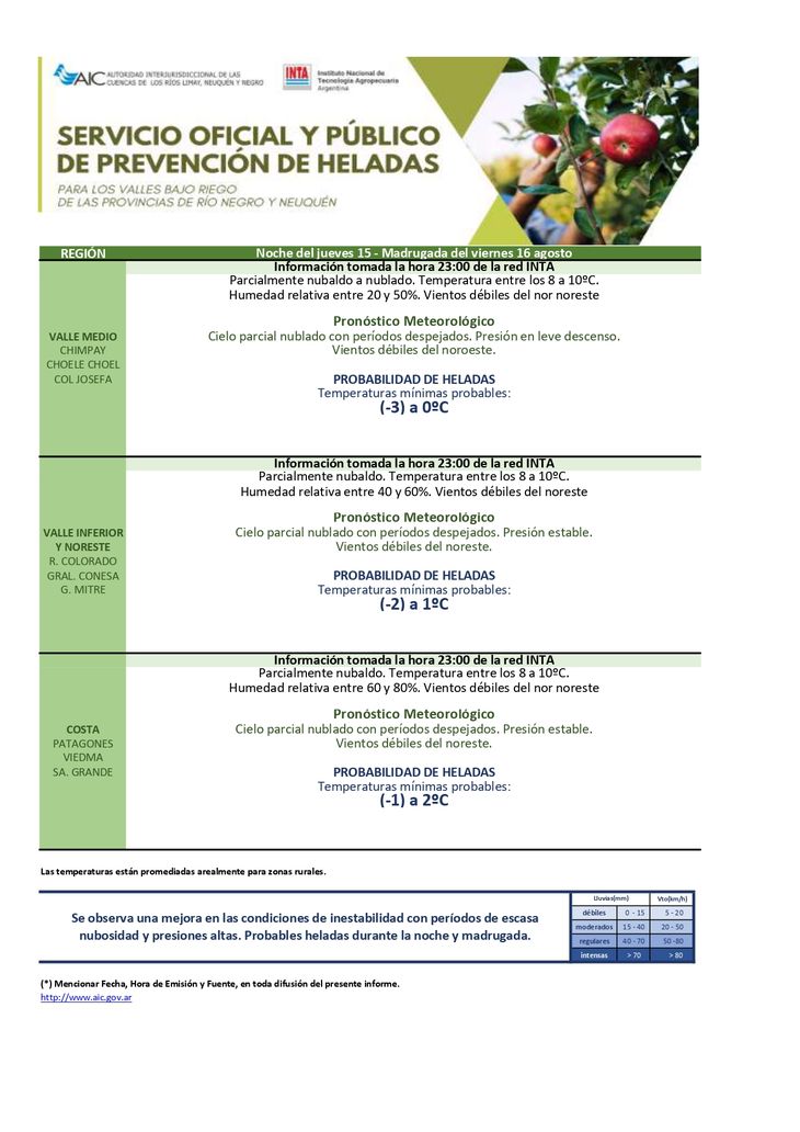 Para la madrugada de mañana, viernes 16 de agosto, el pronóstico elaborado por la AIC, juntamente con el INTA, prevé mínimas de hasta -3°C en las regiones del Valle de Río Negro y Neuquén. Hay riesgo en la producción, sobre todo en frutales de carozo que están -ciertas variedades- en período de floración.