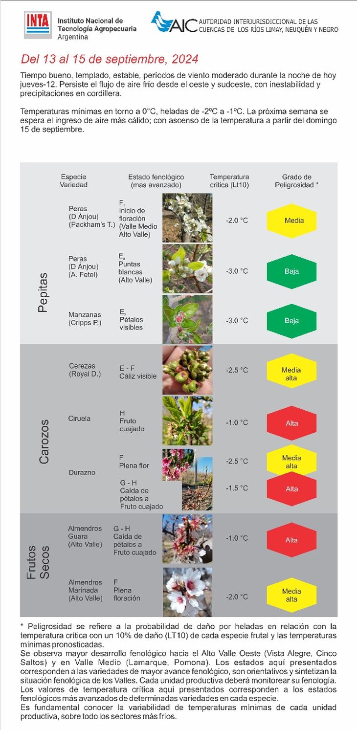 Tal lo señaló anoche en su reporte de heladas la AIC y el INTA, las temperaturas mínimas, que alcanzaron en el Valle de Río Negro y Neuquén -2°C, se mantuvieron en rangos que afectan en forma marginal las plantaciones del Valle teniendo en cuenta el estado fenológico de los frutales.