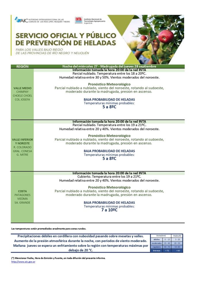 El pronóstico elaborado por la AIC junto con el INTA, se cumplieron para la noche de ayer, el miércoles 27, y madrugada de hoy jueves 28. Las mínimas promedio se ubicaron por encima de los 0°C en toda la región del Valle de Río Negro y Neuquén.