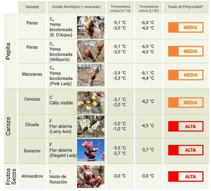 Por su parte, las frutas de pepita –como peras y manzanas– apenas están comenzando a despegar sus yemas. Las variedades de pera D’Anjou y Williams, junto con la manzana Pink Lady, son especialmente sensibles a temperaturas críticas por debajo de los 5 °C. Aunque la floración aún no está completamente desarrollada, las heladas de hoy podrían condicionar el rendimiento de la temporada. En el caso particular de la manzana, los daños severos suelen darse con registros inferiores a los 4 °C, un umbral ampliamente superado en la madrugada.