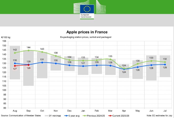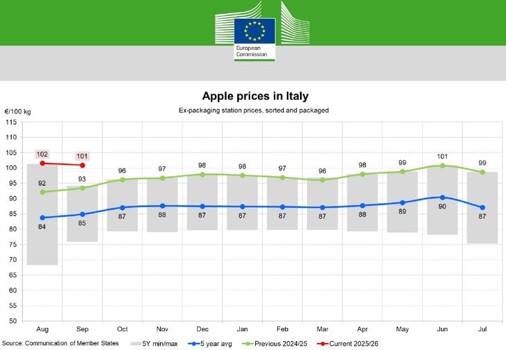 Italia también atraviesa un momento positivo. El precio promedio de la manzana en septiembre fue de 1,01 euros por kilo, apenas un centavo por debajo del nivel de agosto, pero un 9% superior al de septiembre de 2024 y un 19% mayor al promedio quinquenal.